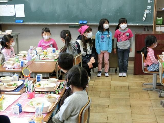 給食でお祝いのマーク入りスープを食した後,体育館で集会が行われました。