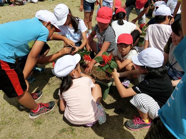 エコ・ワークシェアーズの方たちにご指導いただきながら,子供達は慣れた手つきとチームワークで,手際よく植えることができました。