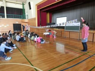 教員が作成した獅子舞体操(運動会)の紙芝居を聞き、櫻井さんのお話の後、間近で獅子舞を見学しました。激しい動きで息づかいも聞こえてくるまど迫力満点でした。