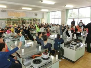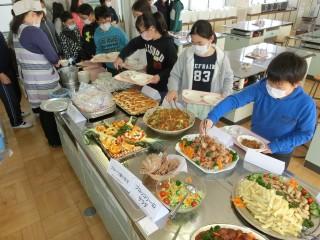6年生は、食事会場となった調理室に入ったとたん、テーブルに所狭しと並んでいる料理を見て歓声をあげていました。