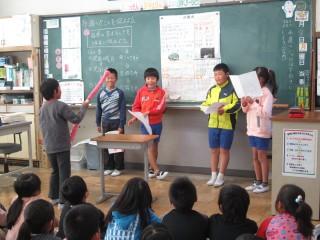 4年生が継続して取り組んでいる総合的な学習の時間「田原の昔を知ろう」で、調べて分かったことを3年生に発表しました。紙芝居、テレビ中継、クイズ形式など、それぞれの班が工夫して発表していました。