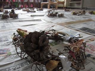 自然いっぱいの色に飾られたリースは、素朴で味わいがありますね。これから小野先生がシルバーのスプレーを吹き付け、リボンをつければできあがります。家庭に飾られる日が楽しみですね。