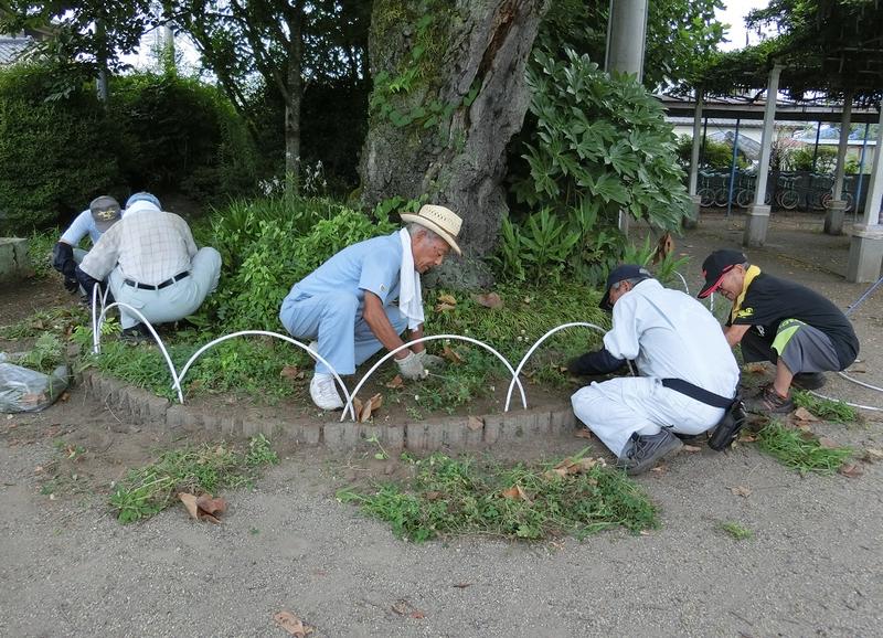 18日,地区の老人会の皆様のご厚意による除草作業が行われました。
