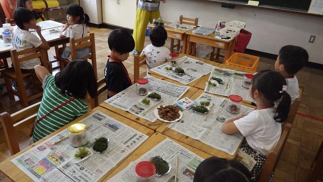 こけテラリウムは,趣向を凝らした可愛らしい作品を作ることができます。今日は,1年生の子供達です。真剣に話を聞き,そして,楽しく制作に取り組んでいました。