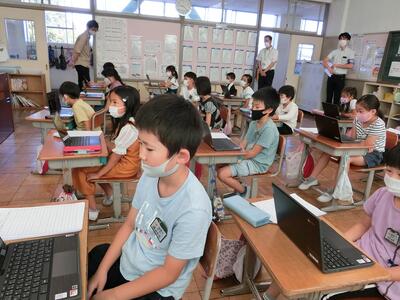 子供たちは、1人1台端末を使い、いちごハウスの様子を見学したり
