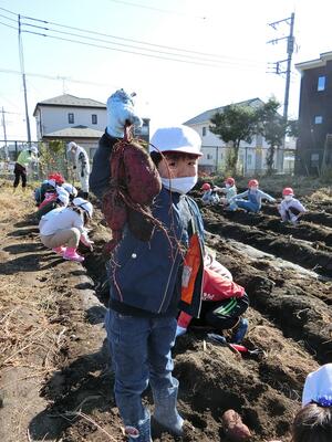 青空の下、1・2年生がサツマイモの収穫を行いました。