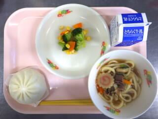 【おはなし給食】肉まん、牛乳、ゆで野菜