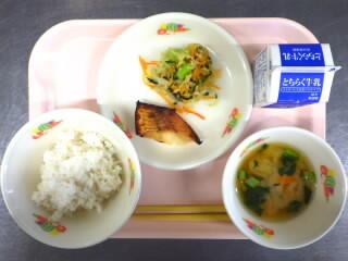 【給食】麦入りご飯、牛乳、赤魚粕漬け、