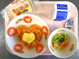 【給食】2/13(金)の給食 投稿日時 : 02/13 田原小学校管理者 カテゴリ: 【給食】チキンライス、牛乳、ハートオムレツ、 ゆで野菜、チョコクレープ 今日はバレンタイン献立です。オムレツはハート 型、デザートにはチョコクレープが出ます。 {{options.likeCount}} {{options.likeCount}}