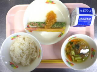 【おはなし給食】麦入りご飯、牛乳、えんぴつの
