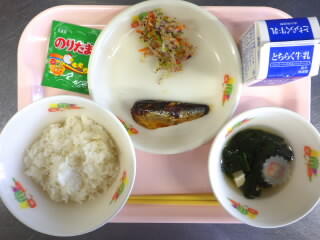 【給食】麦入りご飯、牛乳、いわしの梅じょうゆ煮、