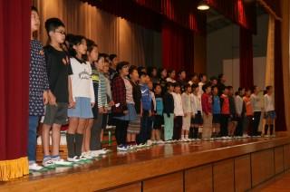 28年度田原地域学校園の歌「ビリーブ」を全員で歌った後、5年生がステージで「海の声」「世界がひとつになるまで」を披露しました。独唱あり、アカペラありの合唱の完成度は高く、さすが高学年の発表でした。