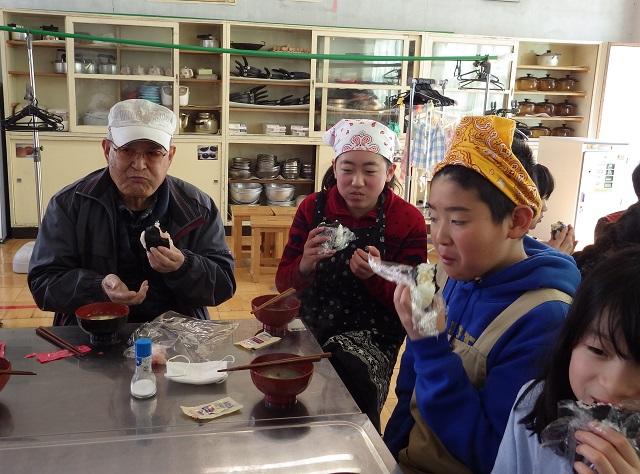 そして,いよいよお米パーティ。ふっくらと炊きあがったご飯でおにぎりを作り,味噌汁と一緒にみんなでいただきました。