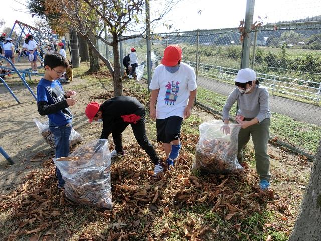 今回の作業は当初,持久走大会に向けてコースの除草を計画していましたが,今年度は持久走を実施しないこともあり,,その代わりとして,高学年のみで山田川沿いの花壇とその周辺の除草及び校庭西側の落ち葉さらいを行いました。