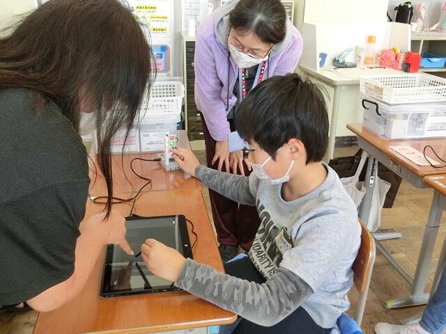 これまでの学習の積み重ねがよくなされていて,組み立て方や操作方法,タブレットの扱いなど誰もが自信をもって取り組んでいました。最後には,今日のめあてに沿ってできたプログラミングを互いに披露し,賞賛し合いました。