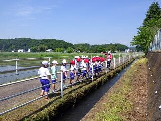 目的地は、学校のすぐ西側を流れる山田川のサイクリングロードです。子どもたちは運動会全体練習の後でしたが、元気に出発しました。