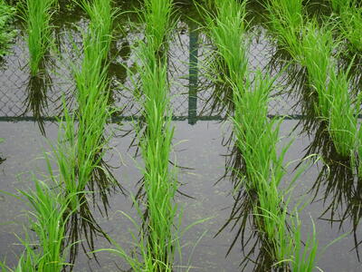 ひと月前に田植えをしたばかりは左の写真のようでしたが,6月12日現在の田んぼは以下のように育ってきています。