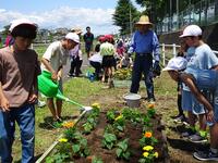 3校時には,いつもお世話になっている「下田原エコワークシェアーズ」の皆様と共に、3年生から5年生の子供たちが校庭のプランター,正門そばの花壇,学校のそばの山田川ぞいの花壇に,マリーゴールドとサルビアの苗を植えました。