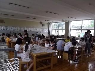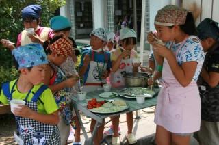 青竹に流れてくるそうめんを箸でつかみ、つゆにつけてツルッと食べる・・・・。流しそうめんは夏の風物詩ともいえます。猛暑が続く中、今年で3回目となる「流しそうめん」が家庭科室前で行われ、45人の子どもたちは夏を楽しみました。本物の青竹を使うと、雰囲気も香りも格別です。