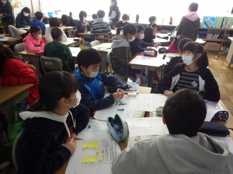 ▼5年生は1組が国語。「テレビとの付き合い方」の文章から,自分とメディアとの関わりを考えました。2,3組は算数。作業を通して多角形の特徴を見つけました。