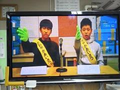どんな風に変わるのか,児童会企画委員会の皆さんが,給食時のテレビ放送で分かりやすく教えてくれました。これからは,声であいさつを交わすだけでなく,ハイタッチをしてのあいさつになります。ユニークなアイディアですね。