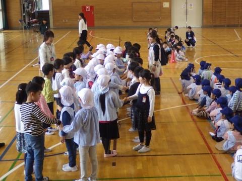 まずは,体育館で「進化じゃんけん」。その後,各教室に移動して,1年生による手作りボーリングや「かめたわー(亀タワー)作り」をして遊びました。