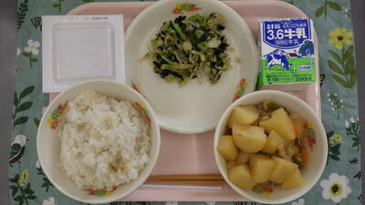 10日の献立は,麦入りごはん,牛乳,さっぱりあえ,豚肉とじゃがいもの煮つけ,納豆でした。