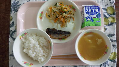 2日の献立は,麦入りごはん,牛乳,いわしの梅しょうゆ煮,切干大根のナムル,麩のみそ汁でした。