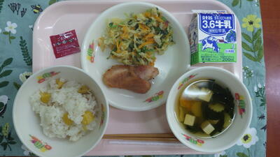 給食では,栗が入った栗おこわと菊の形のかまぼこが入ったすまし汁を提供しました。