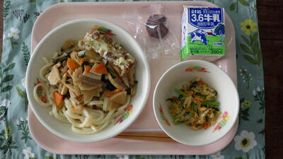 22日の献立は,彼岸うどん,牛乳,ちくわの磯辺あげ,ごまあえ,おはぎでした。