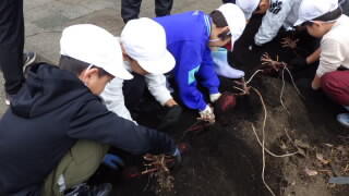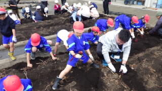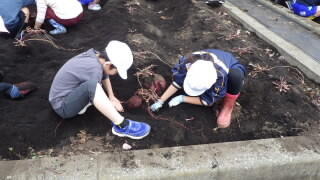 今日の1,2時間目に1・2年生による芋ほりが行われました。春に植えたさつまいもがどれだけ育ったかが分かる授業でしたが,想像以上に大きく育ち,掘り起こすのもやっとでした。1年生も2年生も時には優しく,時には大胆に,土で手足を真っ黒にしながらたくさん掘ってくれました。収穫したサツマイモは1・2年生が持ち帰ったり給食に使用したりしますが,12月の焼き芋にも使用される予定です。食べるのが楽しみですね。