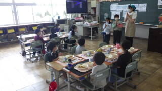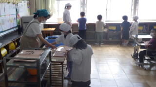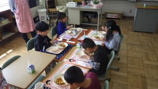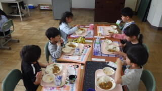 今日は1年生にとって初めての小学校での給食でした。メニューはカレーライスとフルーツヨーグルト。当番さんは白衣に着替えて給食を配膳してくれました。1年生の皆さん,モリモリ給食を食べて元気に成長してくださいね。