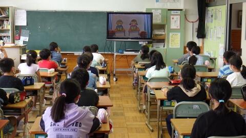 明日から夏休みです。夏休みを前に、テレビ朝会を行いました。