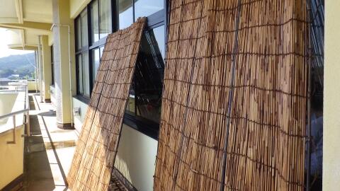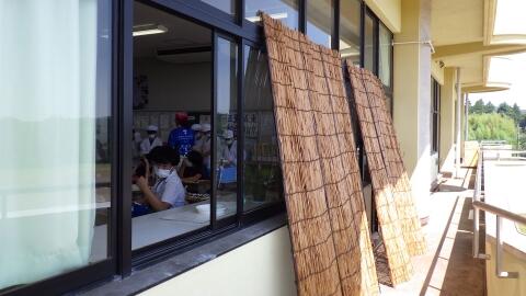 猛暑続きで、教室のエアコンもフル稼働です。例年と違うのは、エアコンをつけている間も、感染予防のために窓やドアを開け放っていることです。そこで、少しでも冷房効率を上げるために、「よしず」を設置しました。購入に当たっては、地域協議会のご協力で、「学校応援基金」から支出していただきました。(「学校応援基金」は、地域の皆様からの寄付金を収入源とし、地域協議会に管理していただいている基金です。)