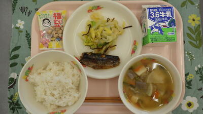 2月3日の献立は,麦入りごはん,牛乳,いわしのおかか煮,白菜の塩こんぶあえ,みそけんちん汁,福豆でした。