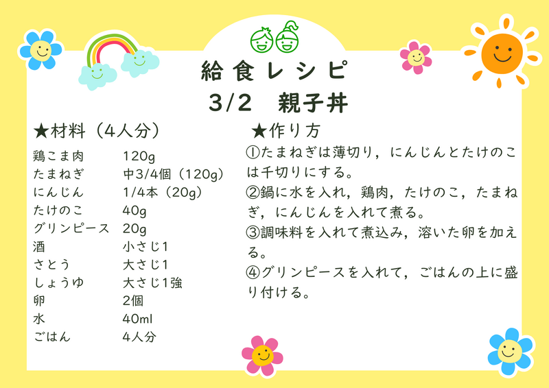 給食の時間に教室に行くと,子どもたちが「この給食おいしいから,レシピを教えて!」とよく言ってくれます。この日の給食から,親子丼のレシピを紹介します。