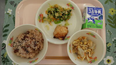 2月2日の献立は,赤飯,牛乳,鶏肉の香味焼き,ごまあえ,KOYOしもつかれでした。