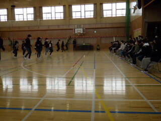 例年、体育館に全校生が集まって実施していますが、今年、体育館にいるのは6年生と進行役の5年生だけです。そこに、1年生から4年生が一学年ずつが順番に入り、出し物を披露します。
