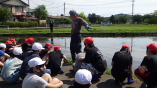 終わった後は、学校田の隣を流れる用水路で、ざっと汚れを流します。