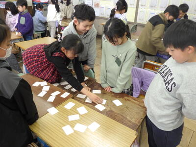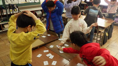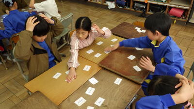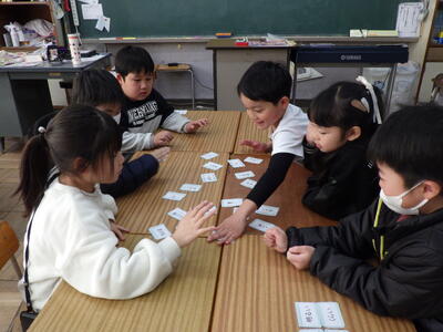学習の2時間目,しっかり覚えられたかを確認するために,32個のカードを用意し,かるた遊びをしました。担任が「大きい」と言ったら、「小さい」と書いてあるカードを探して取るというルールで行いました。とても素直な子供たちは,聞いた通りに「大きい」と書いてあるカードに思わず手が出てしまい,お手つきも楽しみながら,みんな笑顔で取り組むことができました。
