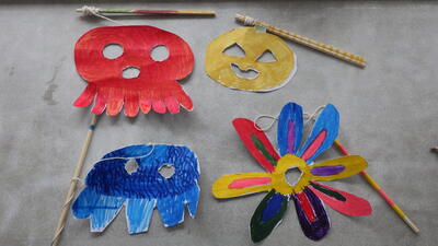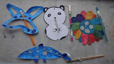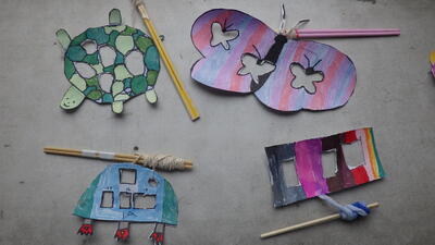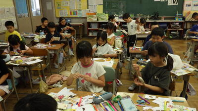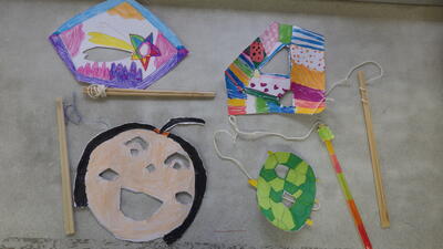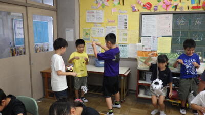 図画工作の授業で、紙けん玉を作りました。画用紙を切り抜いてできた穴に、割り箸を通して遊びます。穴の大きさ、形を工夫して、何度も調整して仕上げました。どのクラスも、色とりどりの、楽しい紙けん玉ができました。