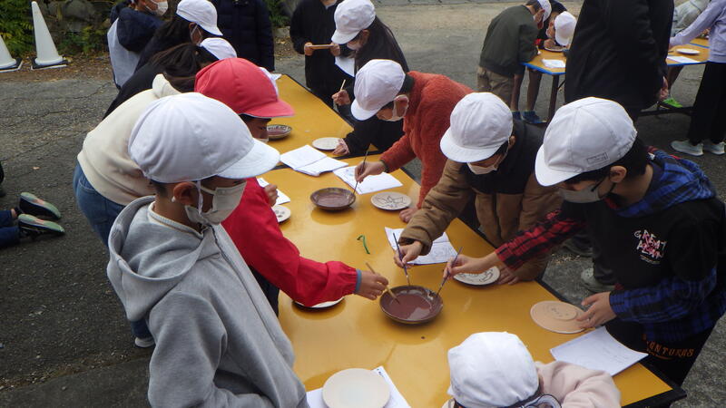 図画工作の授業で、紙けん玉を作りました。画用紙を切り抜いてできた穴に、割り箸を通して遊びます。穴の大きさ、形を工夫して、何度も調整して仕上げました。どのクラスも、色とりどりの、楽しい紙けん玉ができました。