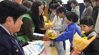 続いて,お手紙と花束の贈呈。「いつもありがとうございます。」「これからも見守ってください。」等,思い思いの感謝の言葉を一言添えて,手渡しました。