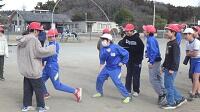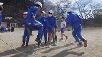 「用意,ピ-ッ!!」 「イチ・ニイ・サン・シッ・・・・」子供たちは,声を合わせリズムに乗ってピョンピョン跳んでいきます。後半は「ハイッ・ハイッ・ハイッ・ハイッ・・・・・・」と掛け声を変え,ますます勢いに乗っていきます。途中で引っかかっても「ドンマイ!」チ-ムワ-クもしっかりと出来上がっていました。