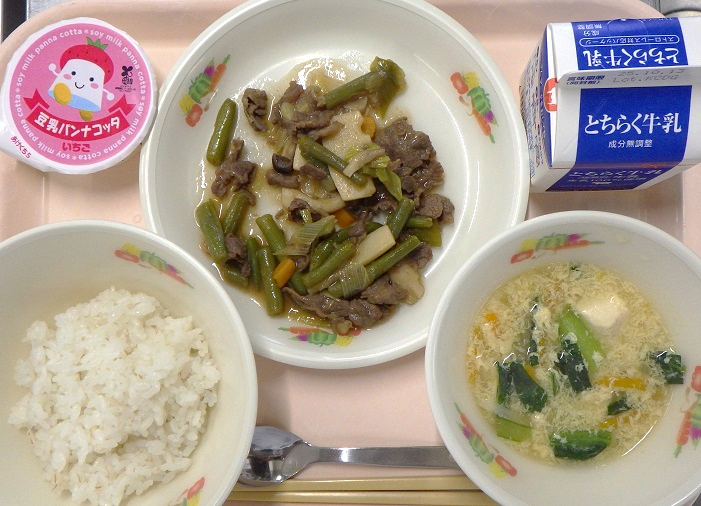 牛肉といんげんのオイスター炒め,豆腐入りかきたま汁,豆乳パンナコッタ(いちごソース)