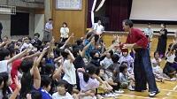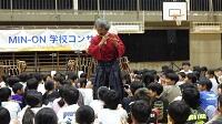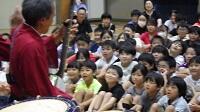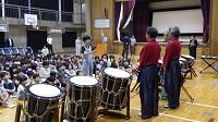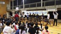 更に、太鼓の「体験コ-ナ-」で子供も教師も思う存分太鼓を叩き、奏者を囲んでのアンコ-ル演奏。最高のボルテージの中で、あっという間の60分は幕を閉じました。