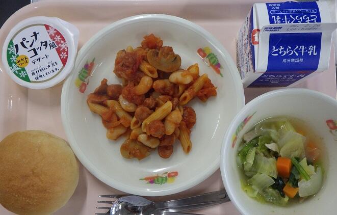 ミニパン,ウィンナーとトマトのペンネ,野菜スープ,豆乳パンナコッタ
