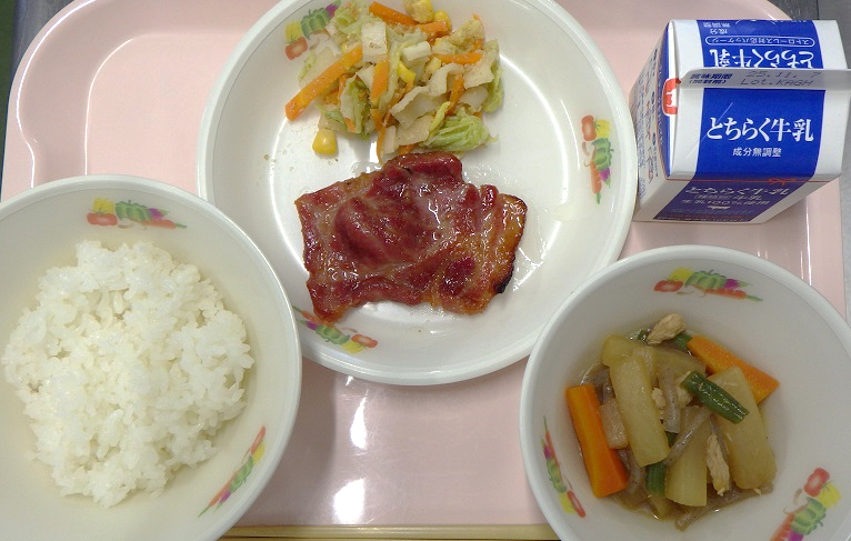 豚肉のみそ漬け焼き,ごま酢あえ,大根とこんにゃくの炒め煮