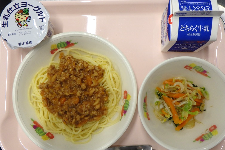 スパゲティ,肉味噌ソース,ナムル,ヨーグルト