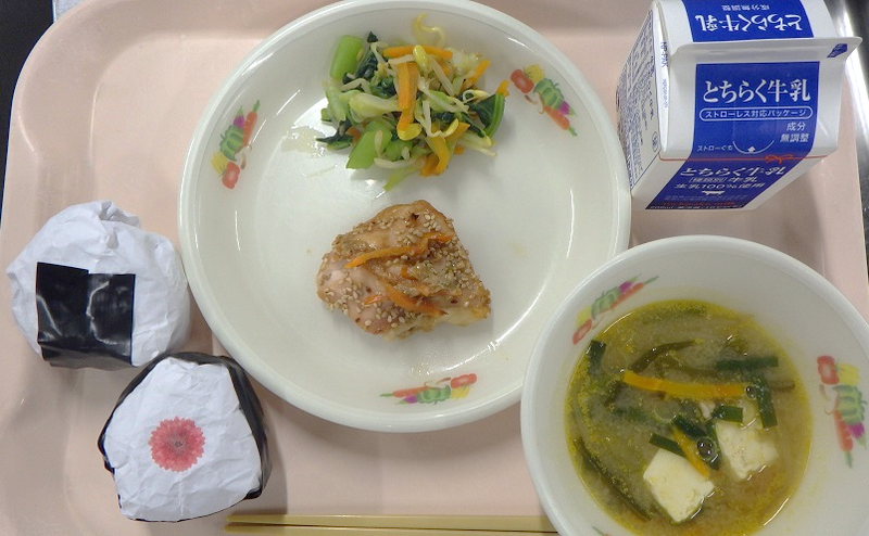 それぞれのおにぎり,鶏肉の漬込み焼き,からし和え,韓国風みそ汁